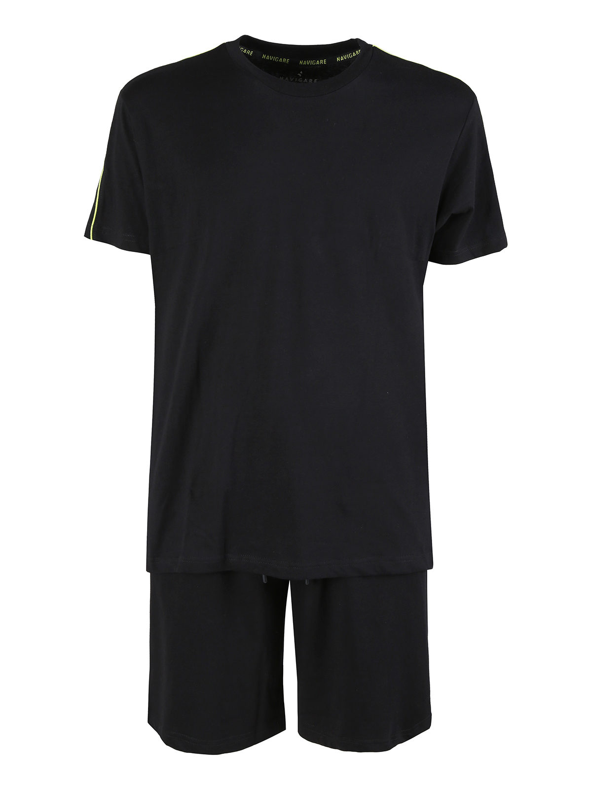 Completo corto da uomo in cotone, composto da: t-shirt girocollo con stampa brand sulla spalla; bermuda in coordinato, con elastico in vita regolabile con coulisse e comode tasche laterali.